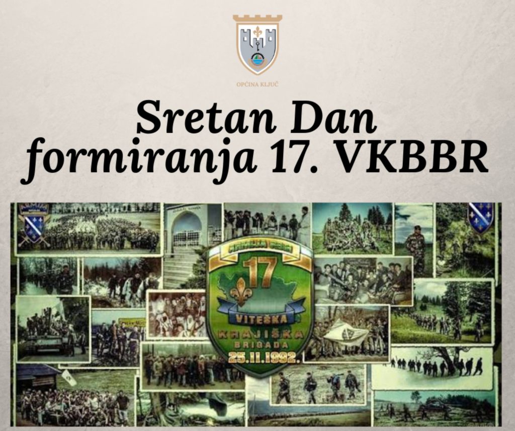 Povodom 25. novembra, Dana formiranja 17. Viteške krajiške brdske brigade, svim pripadnicima ove brigade upućujemo iskrene čestitke u ime Jedinstvenog općinskog organa uprave Općine Ključ i Općinskog vijeća Općine Ključ. Svaka bitka i svaki vaš podvig zlatnim je slovima upisan u historiju naše zemlje. Poručujemo da nikada nećemo zaboraviti Vaš doprinos u borbi za našu slobodu i slobodnu domovinu, Bosnu i Hercegovinu. Porodicama šehida i poginulih boraca, pripadnicima 17. Viteške krajiške brdske brigade, starješinama i komandantima, čestitamo Dan formiranja 17. Viteške krajiške brdske brigade i želimo da svaki naredni 25. novembar dočekate u boljem statusu u domovini kojoj ste dokazali da je znate sačuvati i odbraniti od nasrtaja svih agresora i neprijatelja naše zemlje.